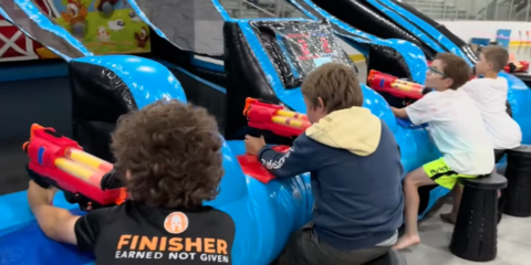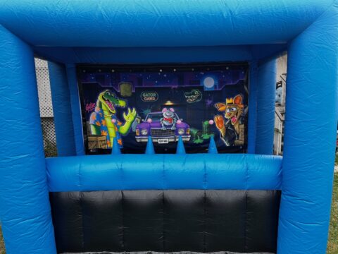 This four-player inflatable shooting gallery is a blast, choose from three fun backgrounds to play on, each comes with high tech sensory targets that keep score on the portable score clock. Challenge your friends as you try to gain the most points using our nerf guns with 30 sponge pellets as the clock counts down. A Game Marshall monitors the players, reloads the guns and makes sure everyone is having fun!